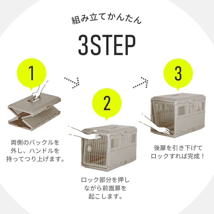 扉はしっかりしたスチール製で大切なペットの空間を守ります。◆組み立てかんたん3STEP