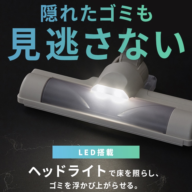 ・LED搭載:ヘッドライトで床を照らし、ゴミを浮かび上がらせる。