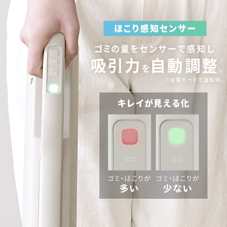 ・ほこり感知センサー:ゴミの量をセンサーで感知し、吸引力を自動調整(※自動モードで運転時。)。ゴミ、ほこりの「多い/少ない」をランプの点灯カラーでキレイが見える化。