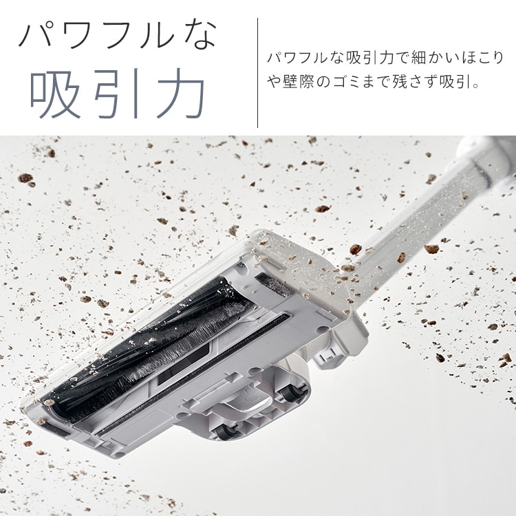 パワフルな吸引力で細かいほこりや壁際のゴミまで残さず吸引。