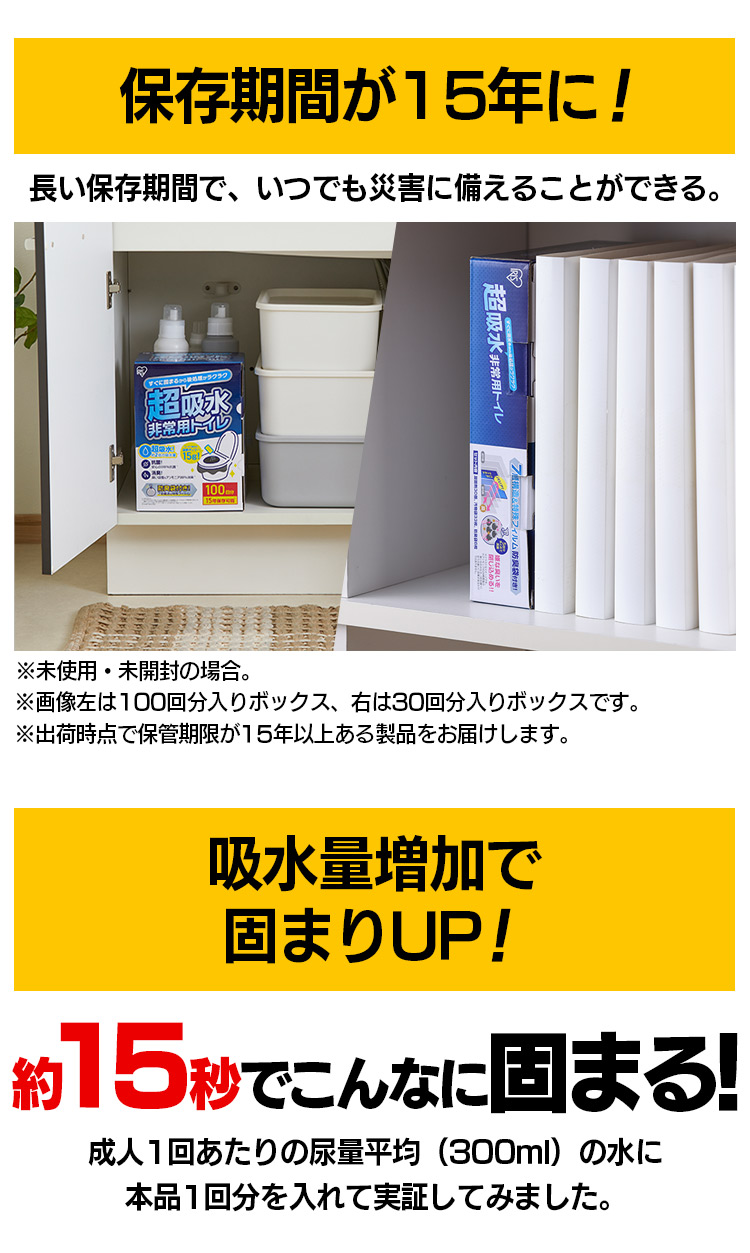 すぐに固まるから後処理がラクラク、超吸水非常用トイレ。
