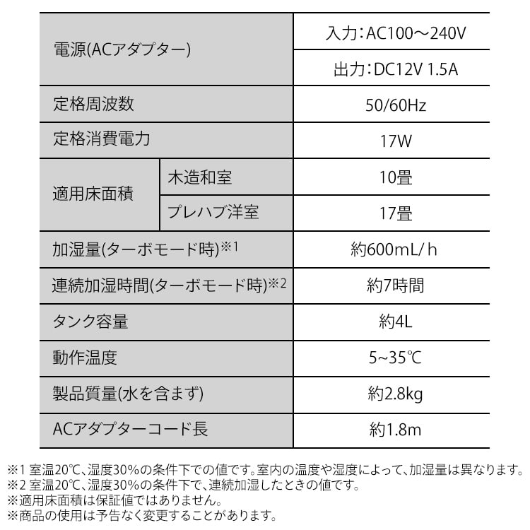 ※2 室温20℃、湿度30%の条件下で、連続加湿したときの値です。