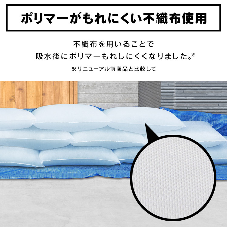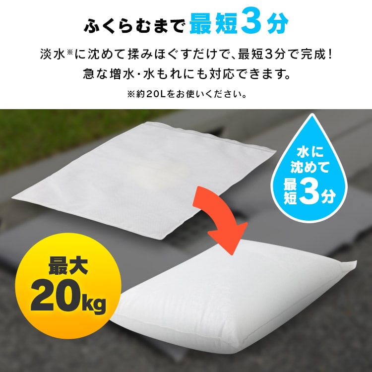 土砂不要で水でふくらむ、使い切りタイプの簡易土のうです。