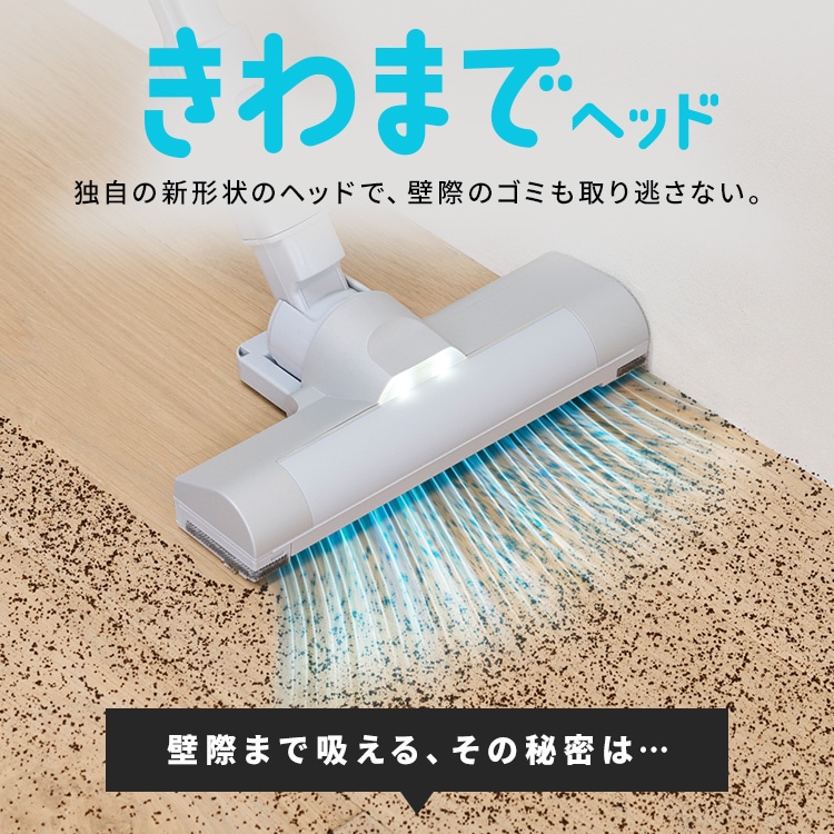 [ダブルエッジ構造:ヘッド両端に付いた斜めのリブ]で、壁際などのゴミも逃さず集めて吸引します。