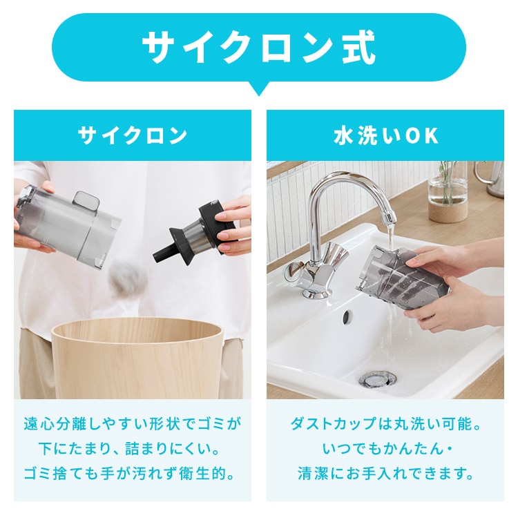 小型で高性能なモーターを搭載しているので、軽くても強力な吸引力でしっかり吸い込みます。