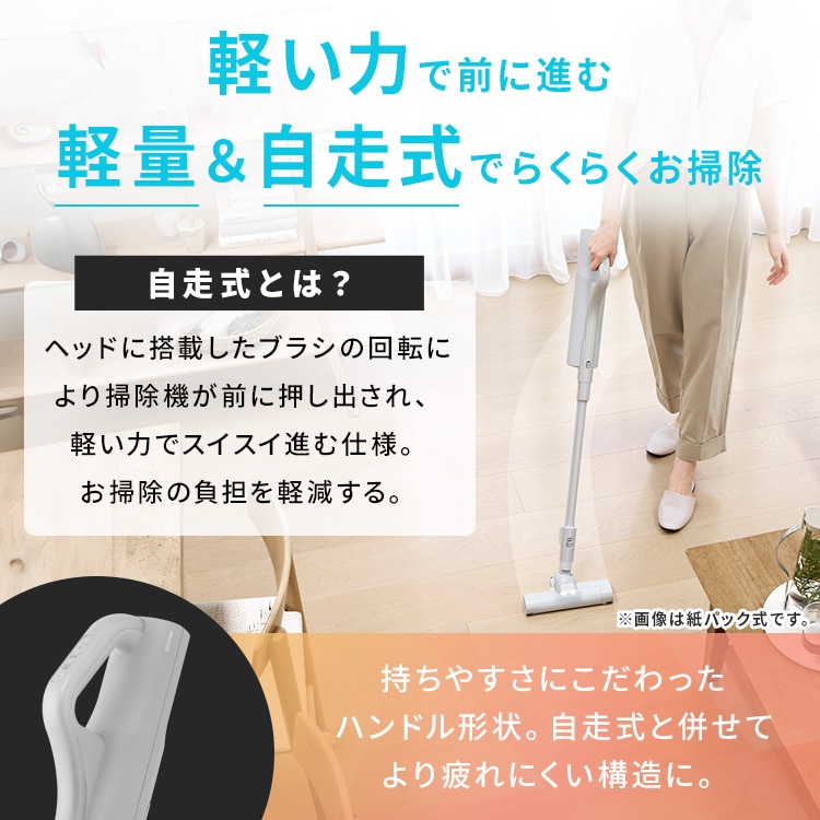 軽い力で前に進む[自走式:ヘッド部分に搭載しているブラシが回転し掃除機自体を前進させる]なので、お掃除の負担を軽減します。