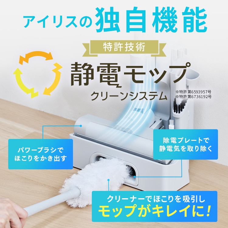 アイリスオーヤマ独自技術[静電モップクリーンシステム]を搭載しています。