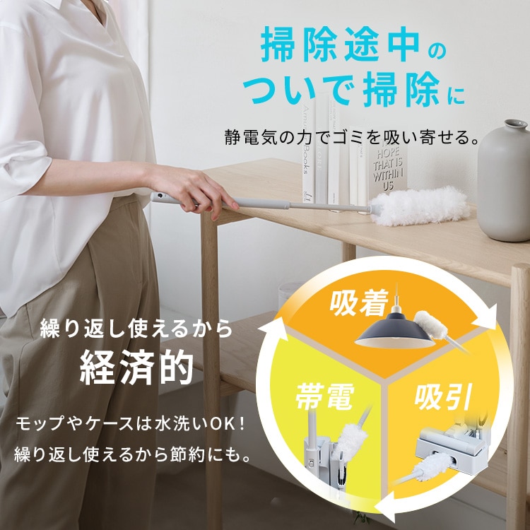 モップ帯電ケースで静電気を帯電させ、ほこりを吸着し、クリーナーで吸引するから何度も使えて経済的です。