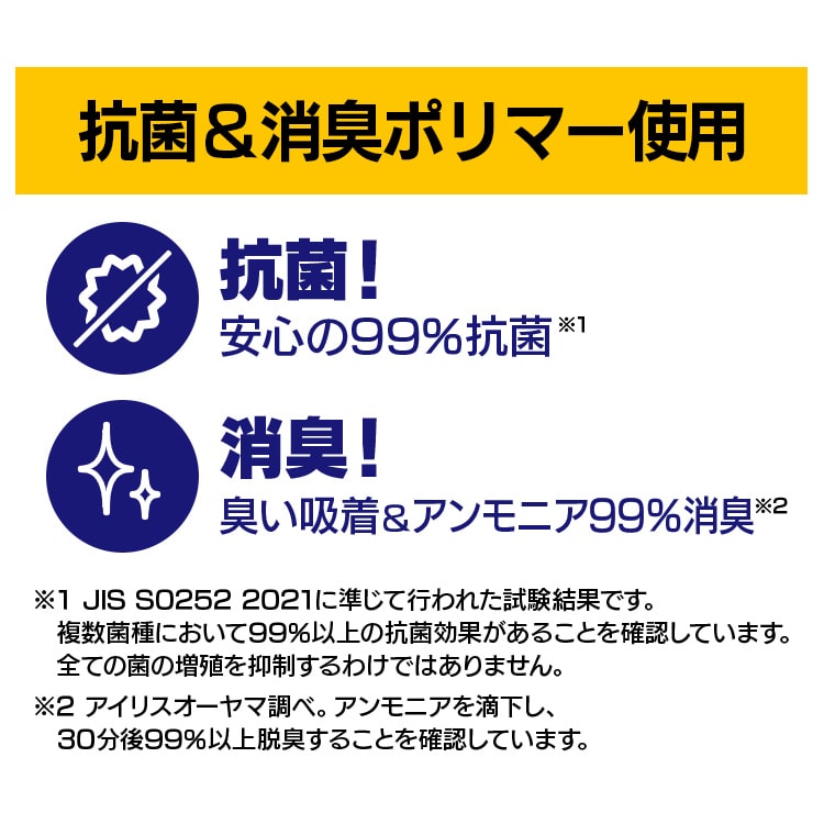 [約15年保存可能(※1)/99%抗菌(※2)/ニオイ吸着&アンモニア99%消臭(※3)]です。