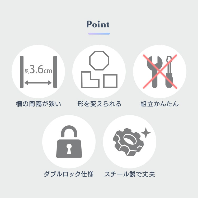 自由に形状を選べるので、お部屋に合わせてレイアウトできるスチールサークルです。