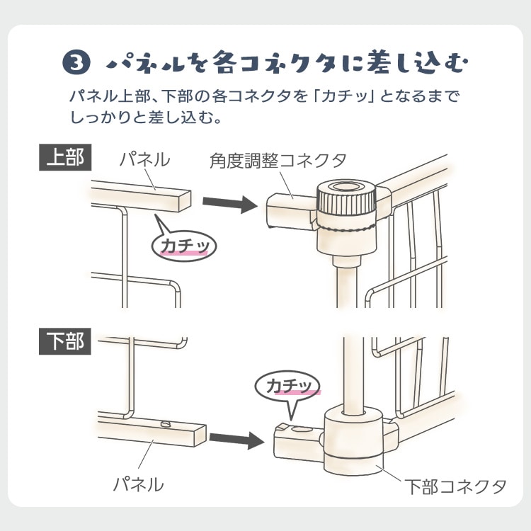 パネルを各コネクタに差し込み角度を調整して固定パーツをロックするだけで、工具不要で簡単に組み立てができます。