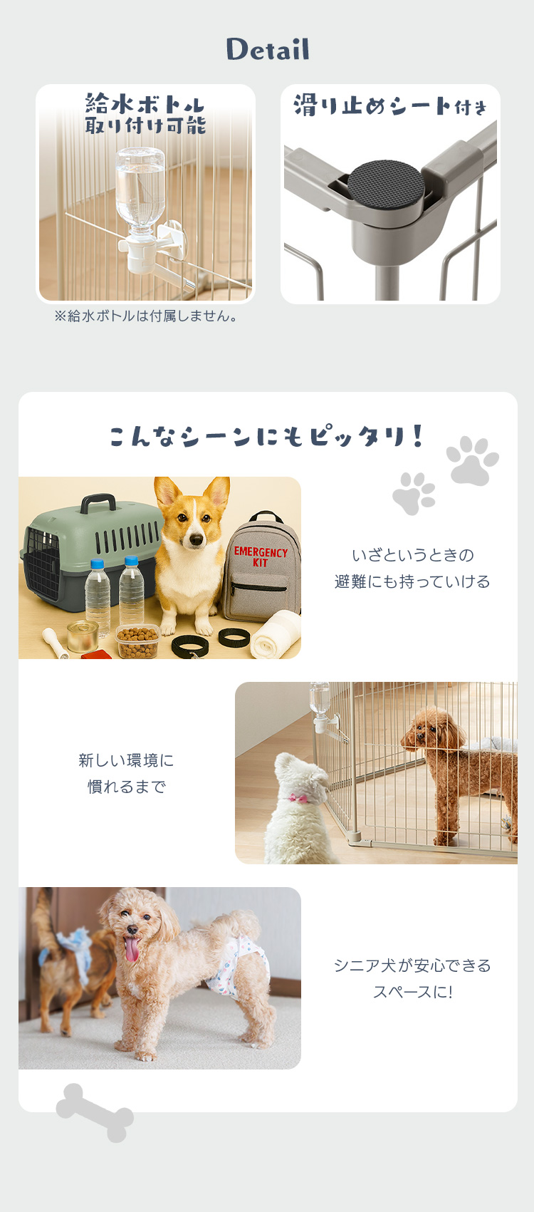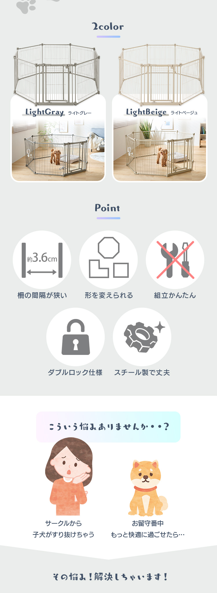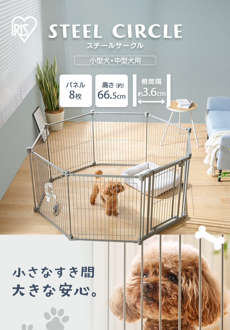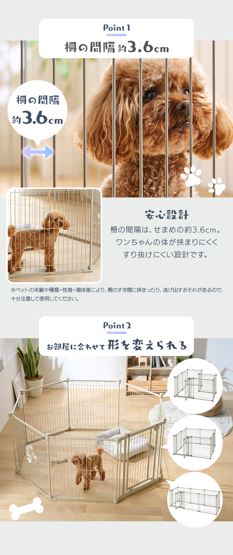 パネルの線材のすき間が約36mmで、子犬でも挟まりにくい安心設計です。
