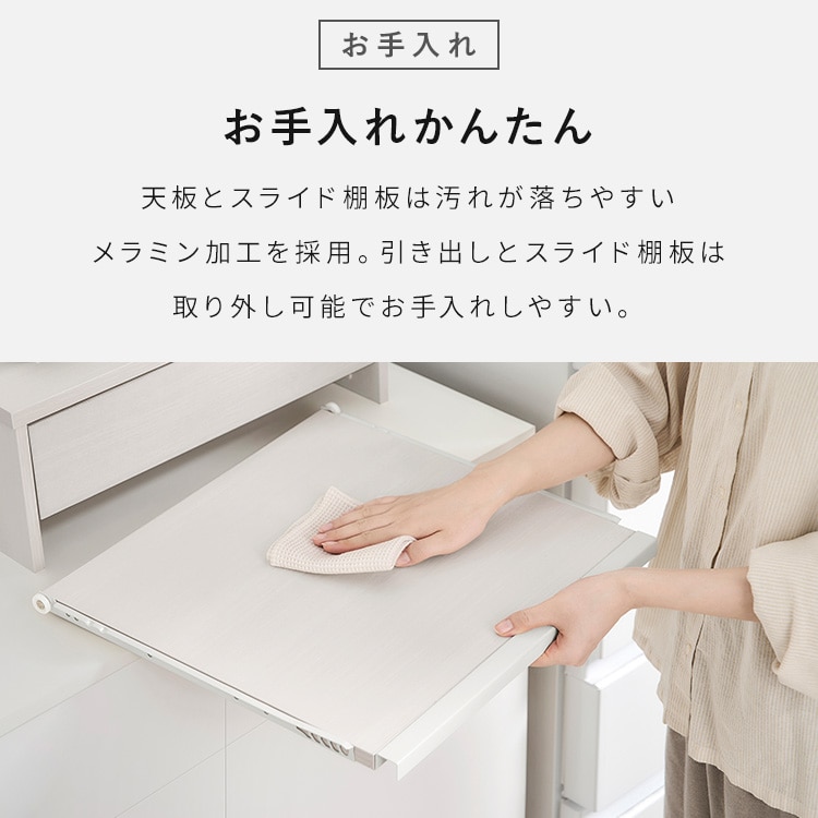 天板とスライド棚板は汚れが落ちやすいメラミン加工を採用。