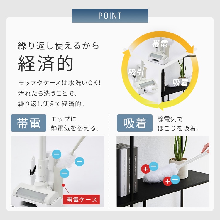 モップ帯電ケースで静電気を帯電させ、ホコリを吸着し、クリーナーで吸引するから何度も使えて経済的です。