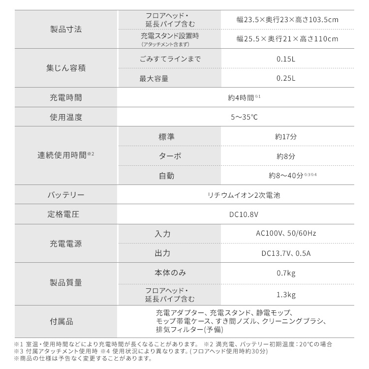(※バッテリーの劣化、フィルターの汚れ具合、使用環境に異なります。ゴミはこまめに捨ててください。)
