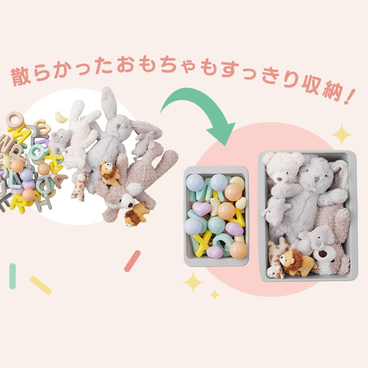 色分けされていることで「どこに何を片付ける」のルールが決めやすく、お子様の自立心をサポートし楽しくお片付けができる収納用品です。