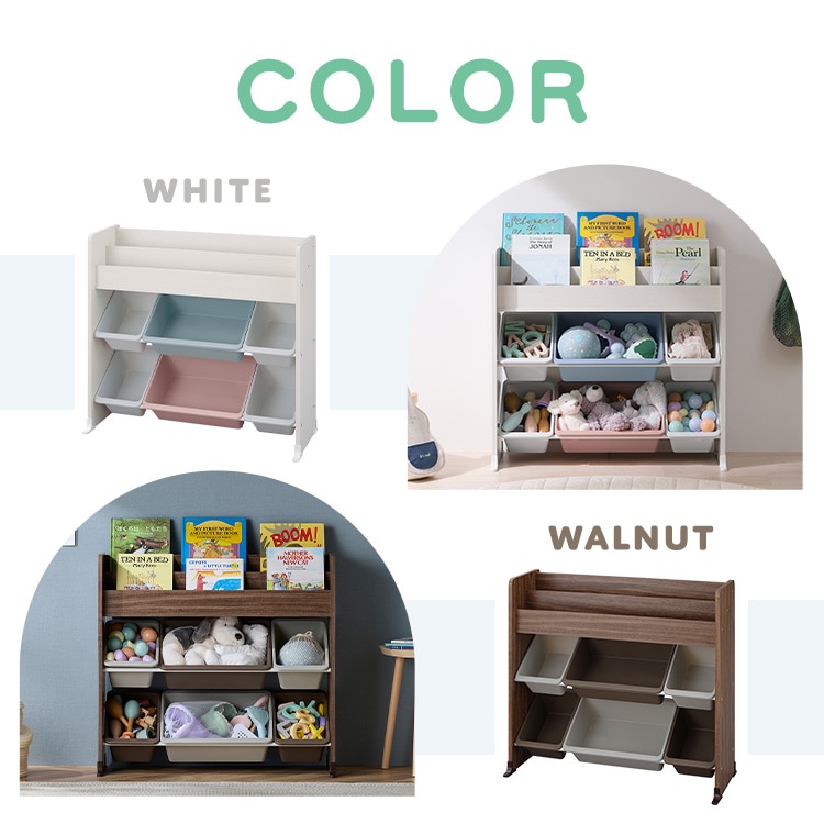 上段は絵本棚になっており、上段は絵本、下段はおもちゃなど、物を分けて収納できる!