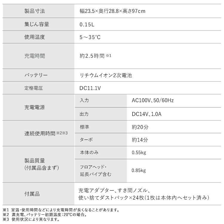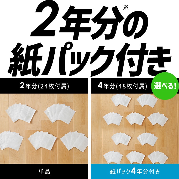 充電アダプター、すき間ノズル、使い捨てダストパック×24枚(1枚は本体内にセット済み)