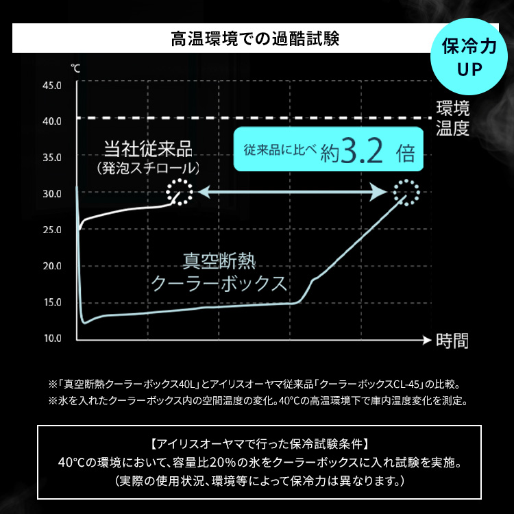 ※【保冷試験条件】容量比40%の氷をクーラーボックスに入れ、30℃9h-20℃15hで保管後に氷重量を測定。氷が溶け切るまでの時間を算出(アイリスオーヤマ試験結果)。