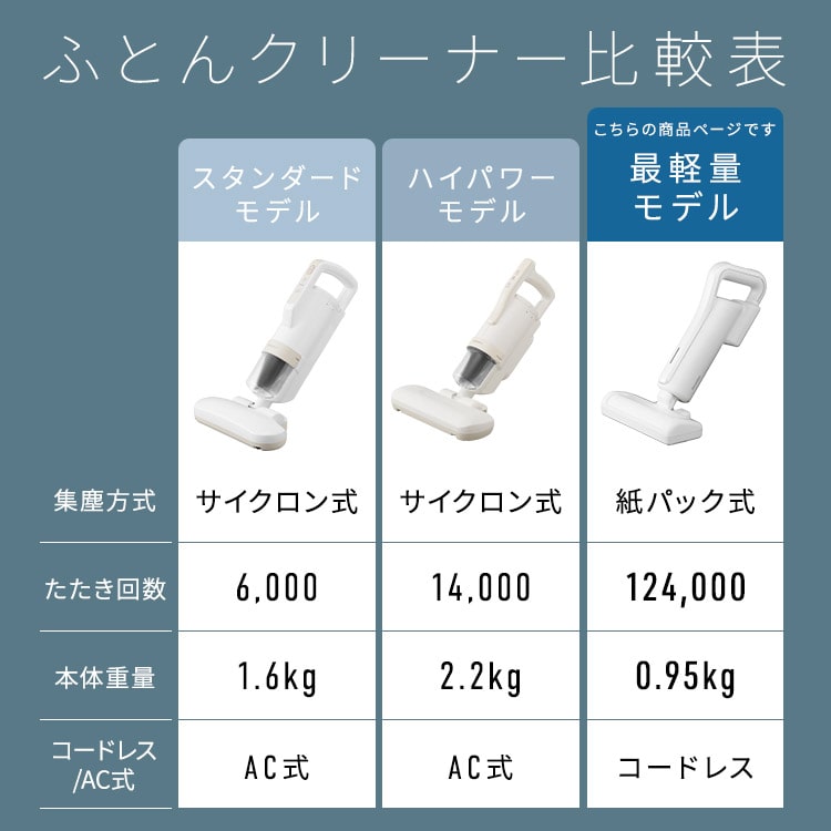 1kgを切る軽量+コードレスで使いやすさが向上した充電式紙パックふとんクリーナーです。