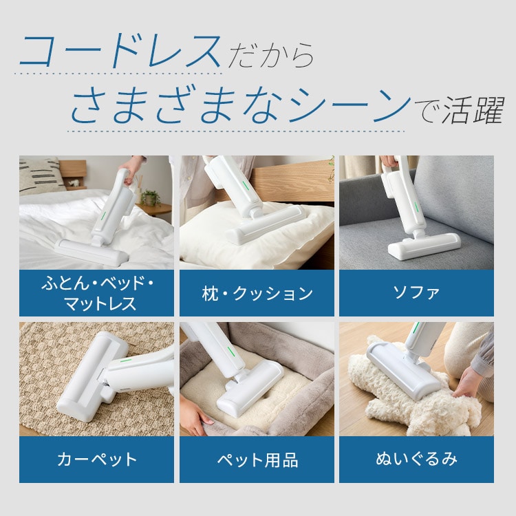軽量+コードレスで簡単に持ち運びができるので、ふとんだけではなく、カーペット・ソファ・車の座席でも使用できます。