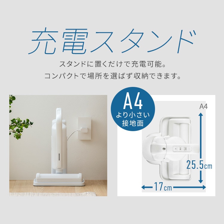 充電スタンド付なので、お掃除が終わったらスタンドに置くだけで、コンパクトに収納もできます。