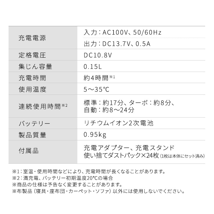 充電アダプター、充電スタンド、使い捨てダストパック×24枚(1枚は本体内にセット済み)