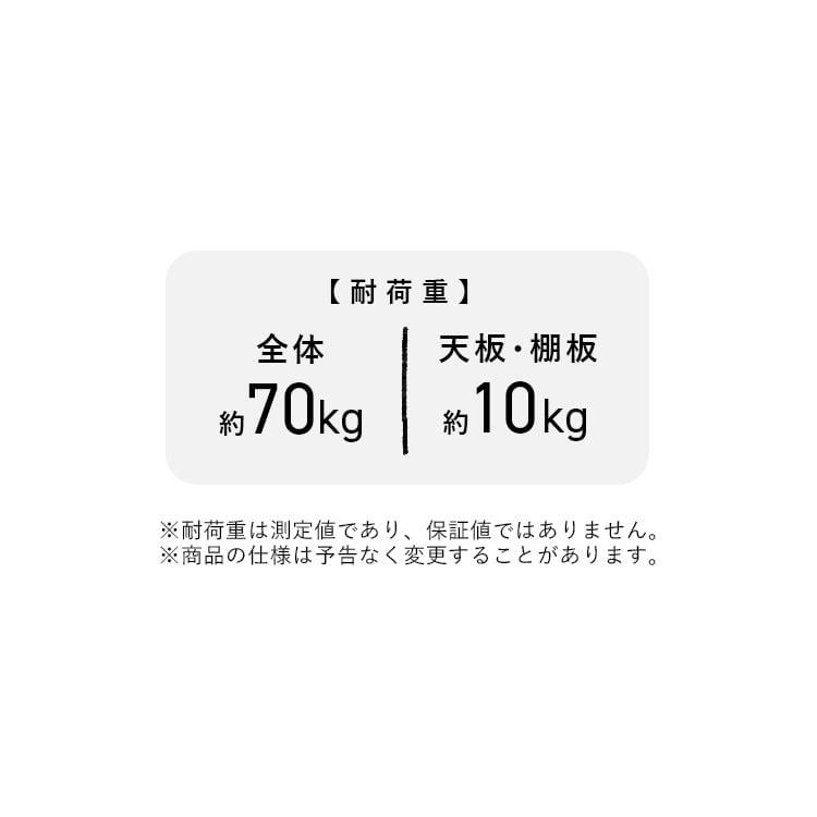 固定棚板(大)1枚あたり:約10kg、固定棚板(小)1枚あたり:約10kg、可動棚板1枚あたり:約10kg