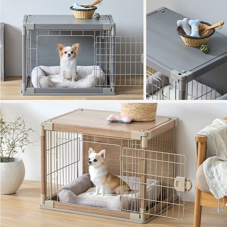 木製の屋根と背面板を付け、ワンちゃんがリラックスできる空間を目指したサークルです。