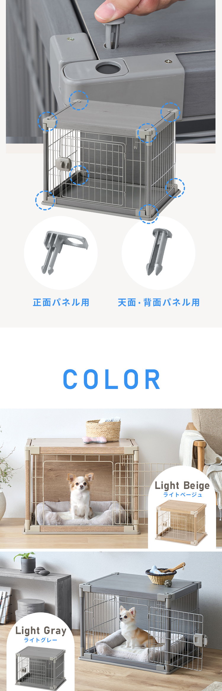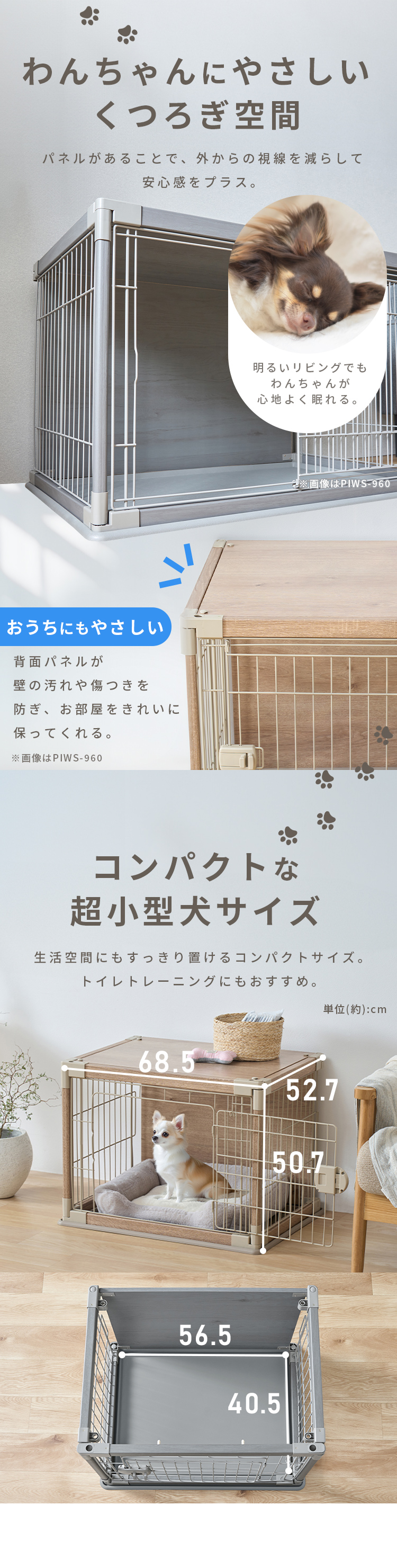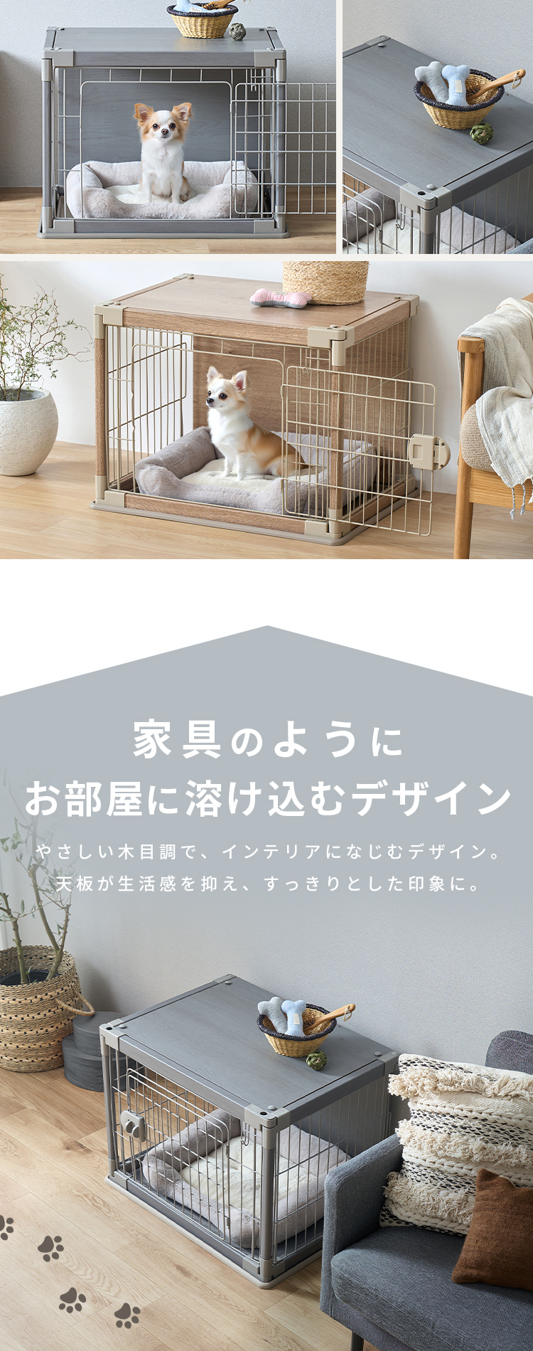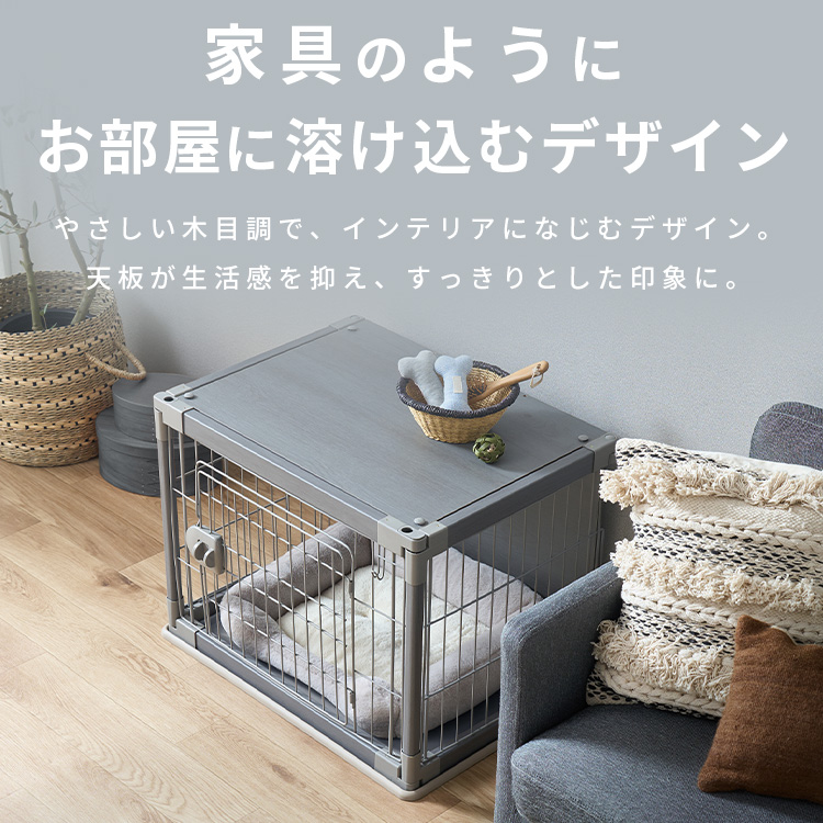 木製の屋根と背面板を付け、ワンちゃんがリラックスできる空間を目指したサークルです。