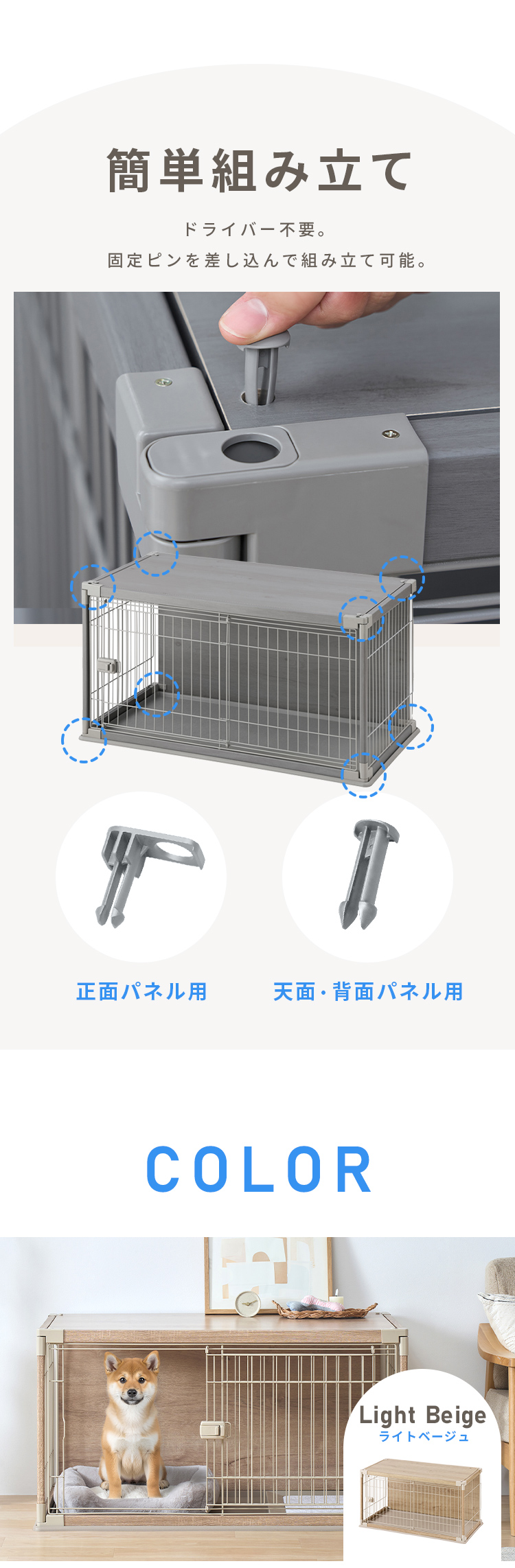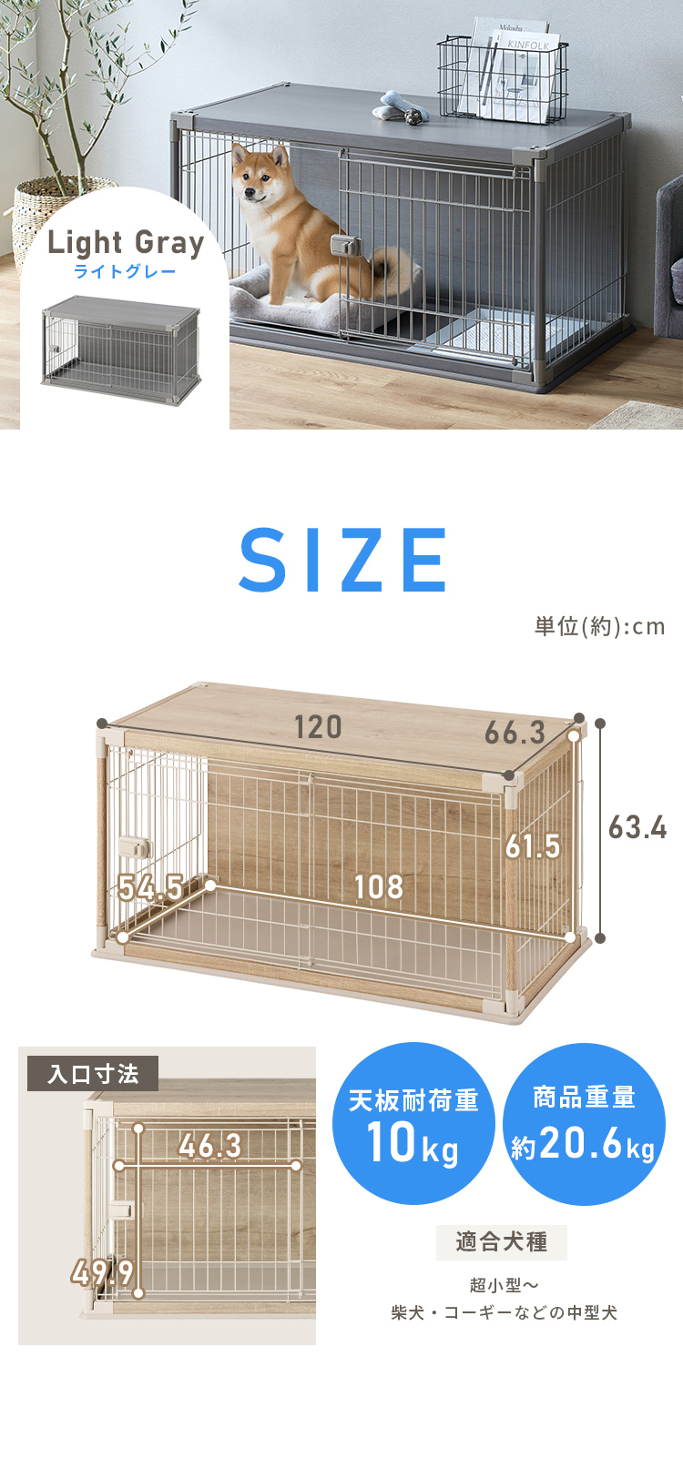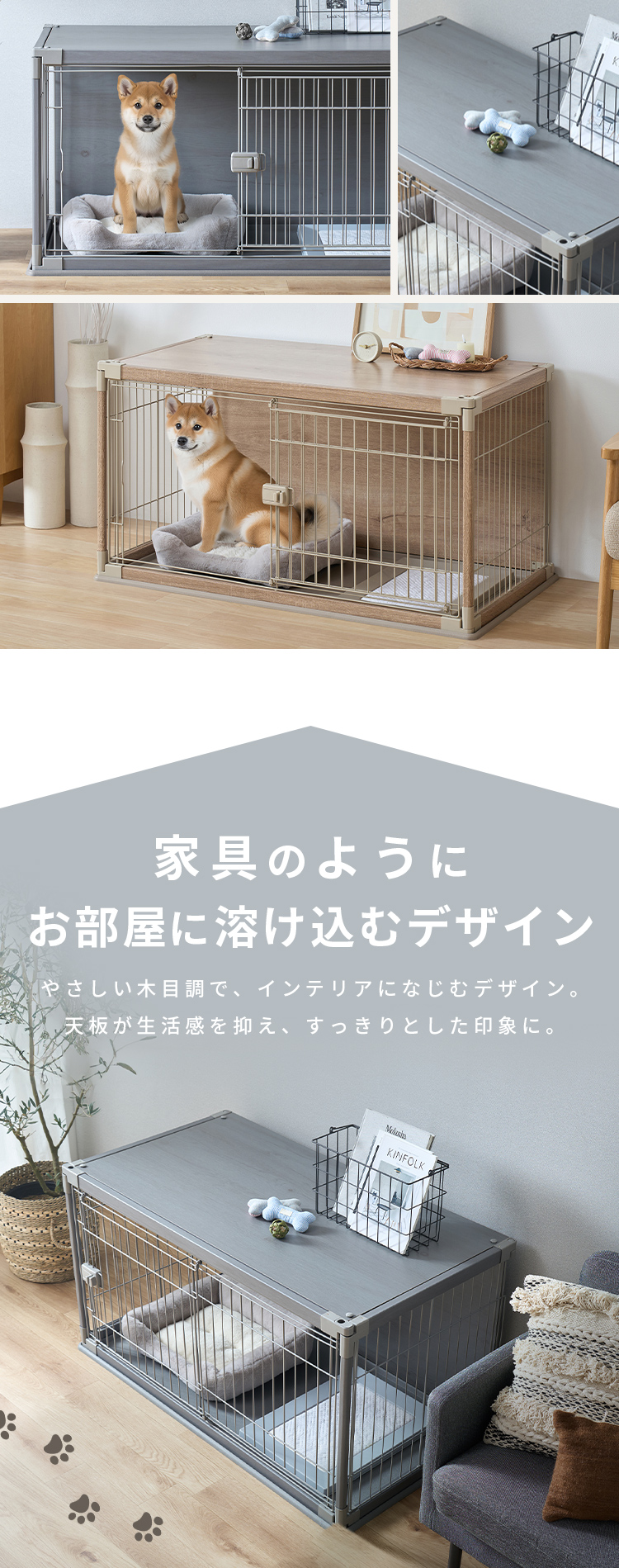 木製の屋根と背面板を付け、ワンちゃんがリラックスできる空間を目指したサークルです。