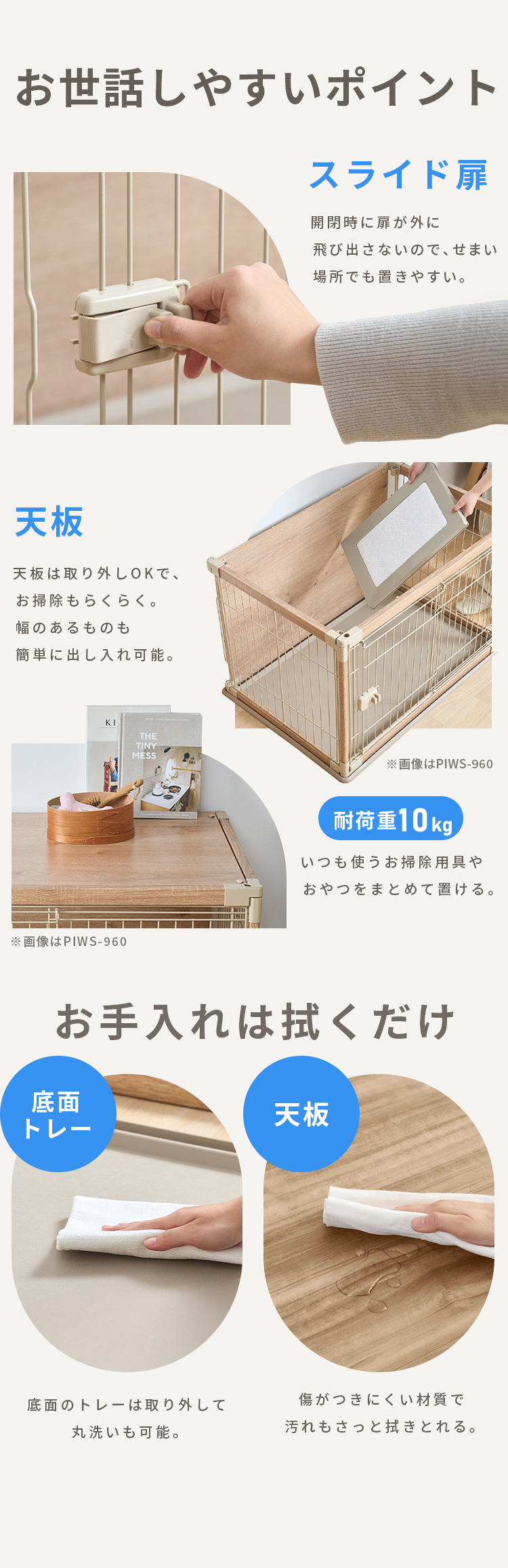 屋根・背面板はメラミン樹脂製のシートを使用しているので、ふき取り等のお手入れが簡単です。