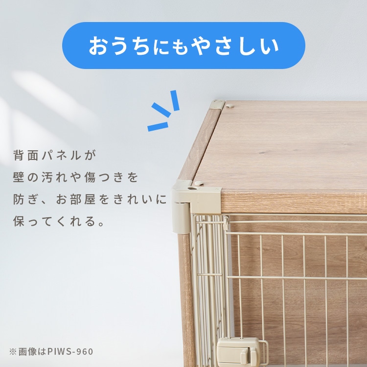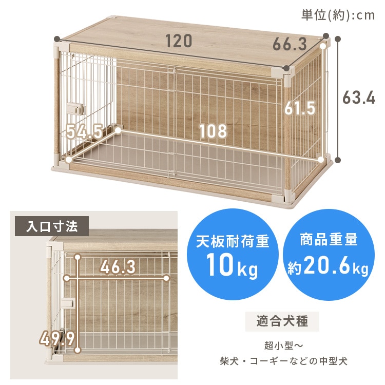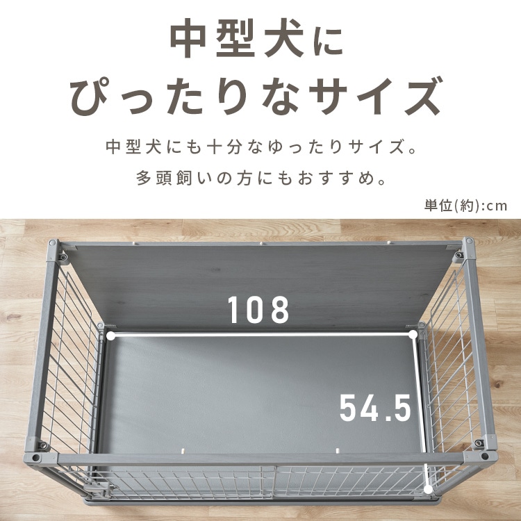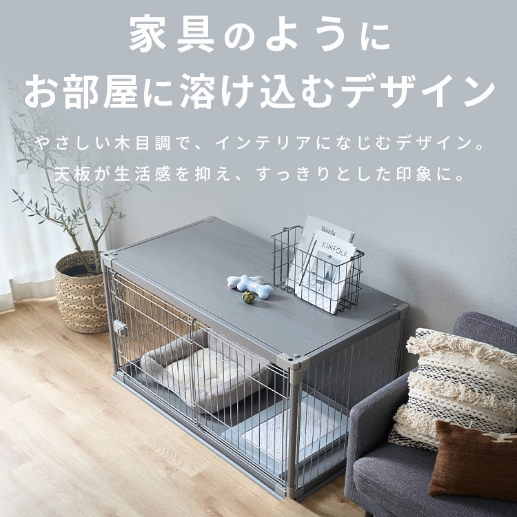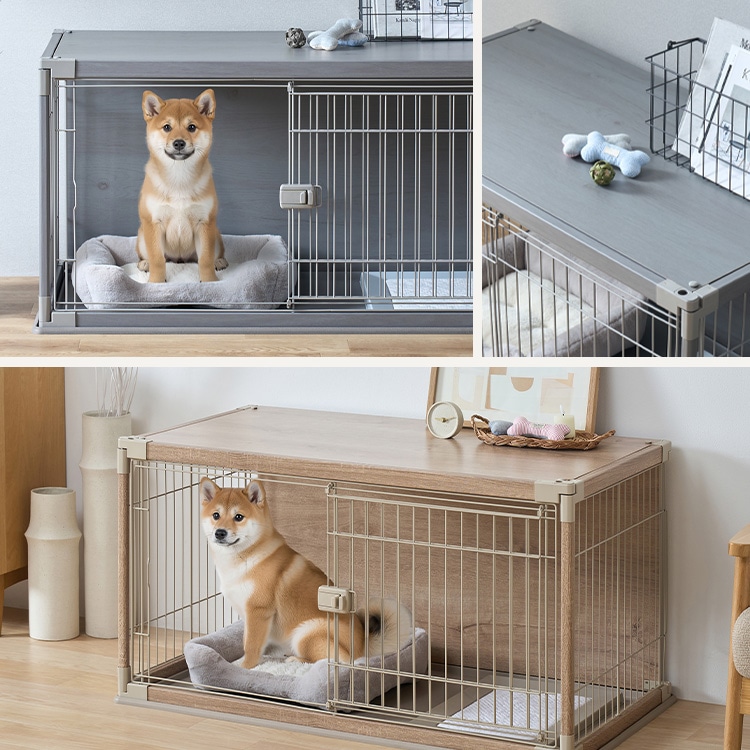 木製の屋根と背面板を付け、ワンちゃんがリラックスできる空間を目指したサークルです。