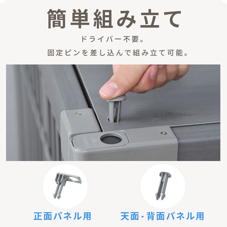 ワンタッチピンを差し込むだけで工具不要で簡単に組み立てができます。