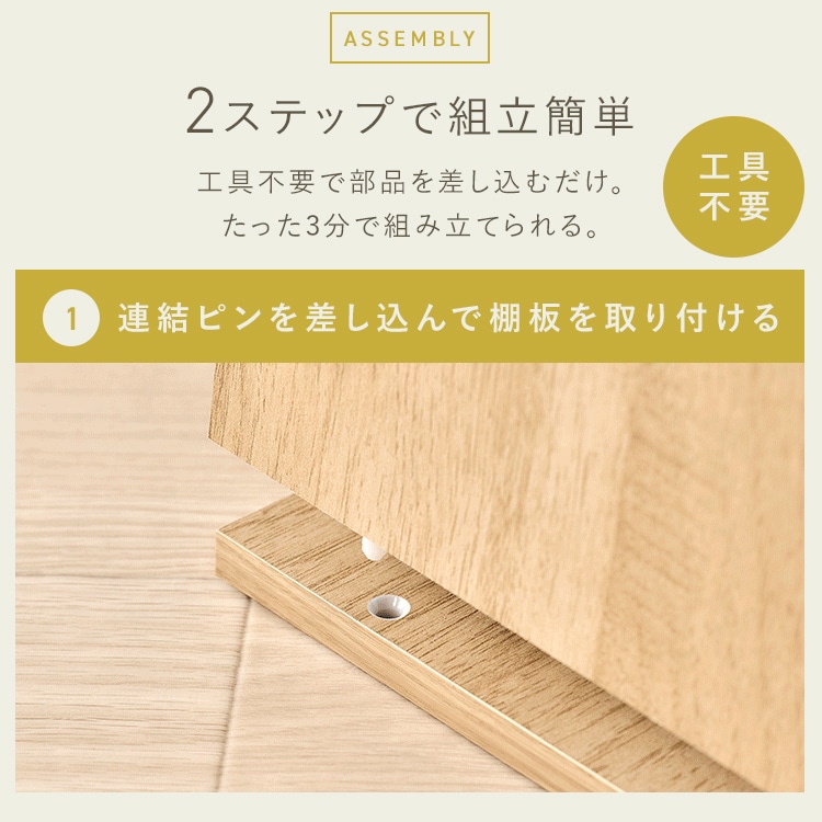 工具不要で、棚板とワイヤーを取り付けるだけで簡単に組み立てることができます。