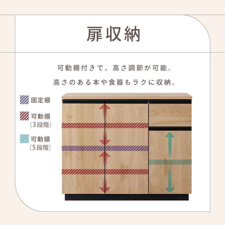 小扉は5段階、大扉は上段・下段それぞれ3段階可動できます。大扉は固定棚板があります。