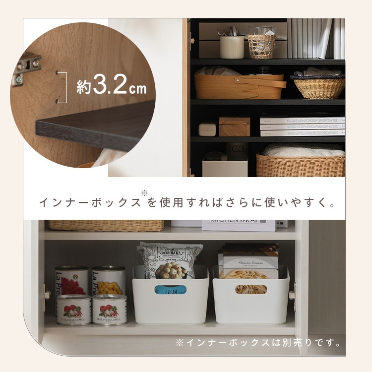 扉内収納は可動棚で約3.2cm間隔で、収納物に合わせて高さを自由に調整可能です。