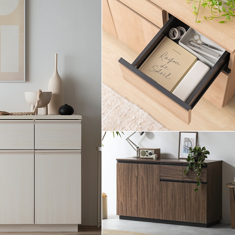 隠す収納で、お部屋をすっきりみせられるリビングキャビネットです。