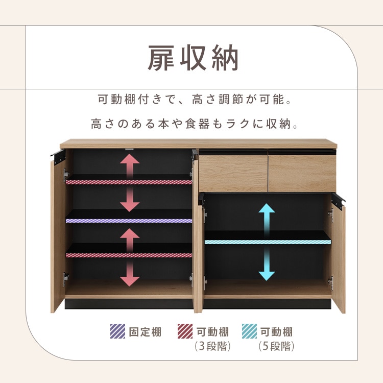 小扉は5段階、大扉は上段・下段それぞれ3段階可動できます。大扉は固定棚板があります。