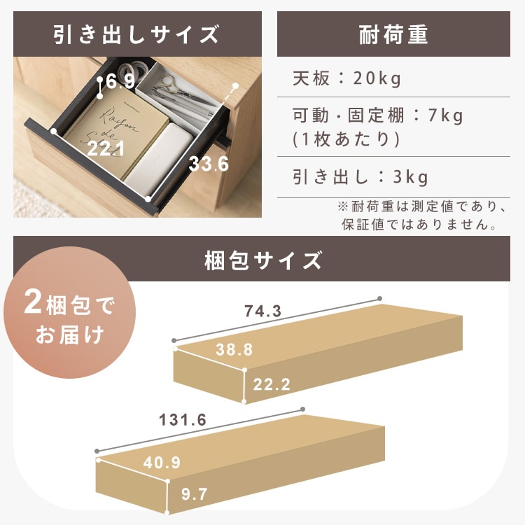 全体約68kg、天板約20kg、底板(左)約7kg、底板(右)約7kg、可動棚板1枚あたり約7kg、固定棚板(左)約7kg、引き出し1個あたり約3kg