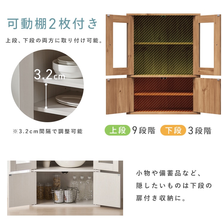 ガラス扉内は約3.2cm間隔で9段階、下扉内は約3.2cm間隔で3段階、調節できます。