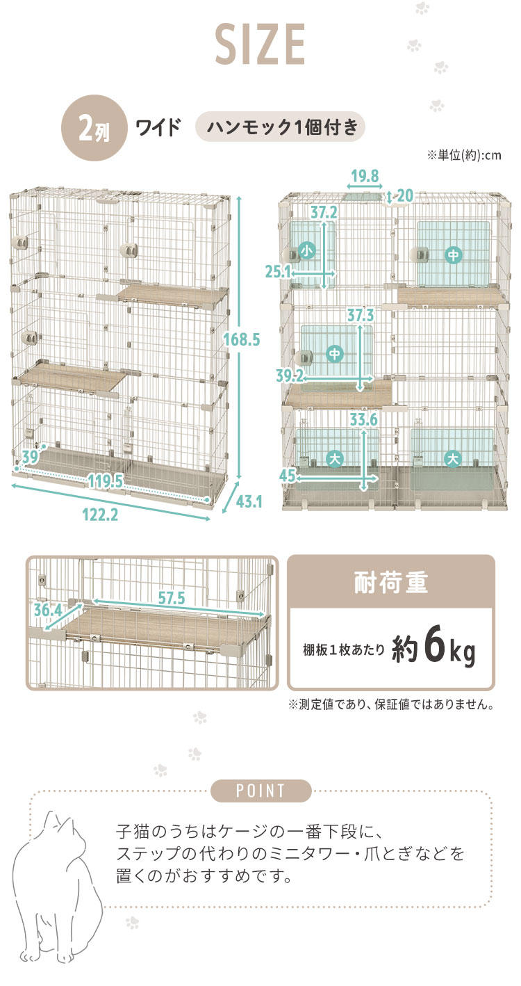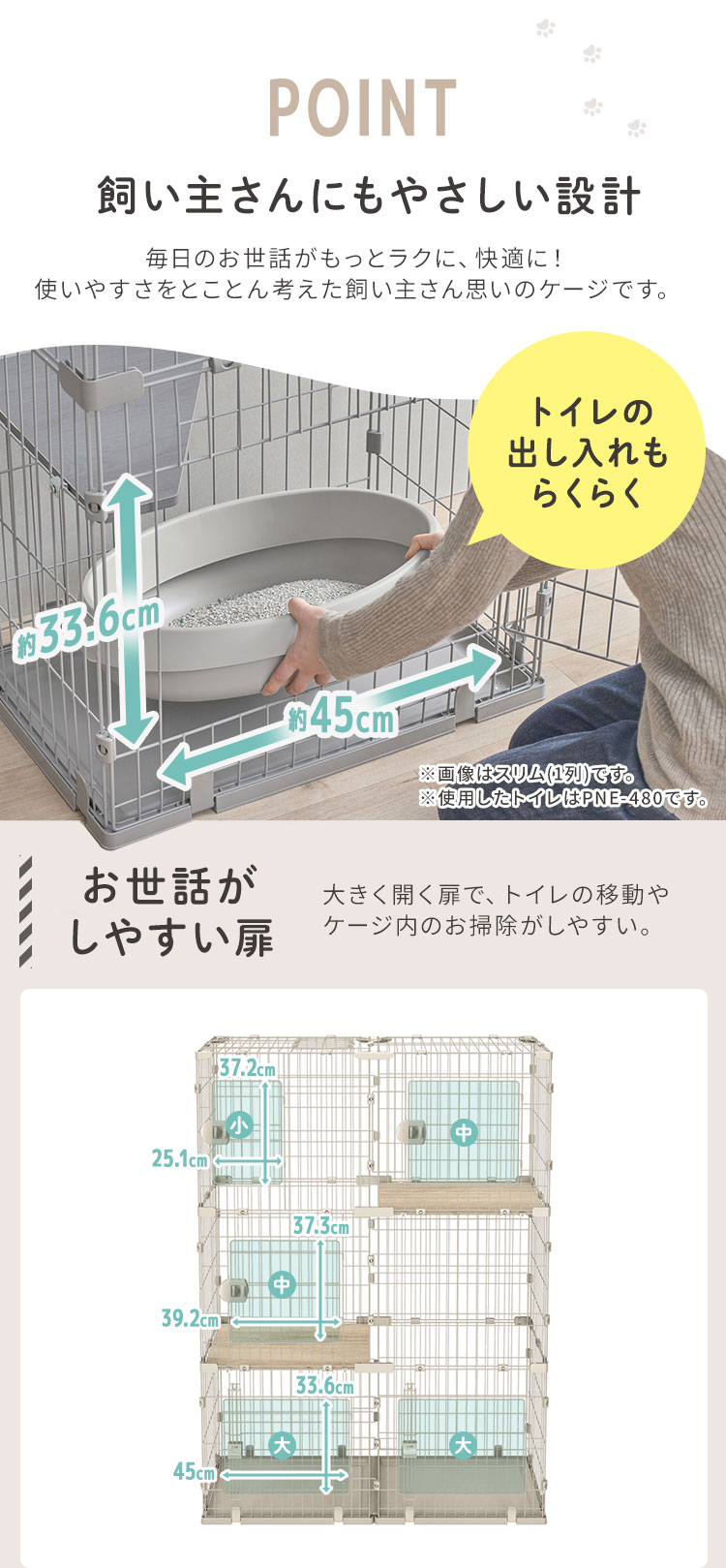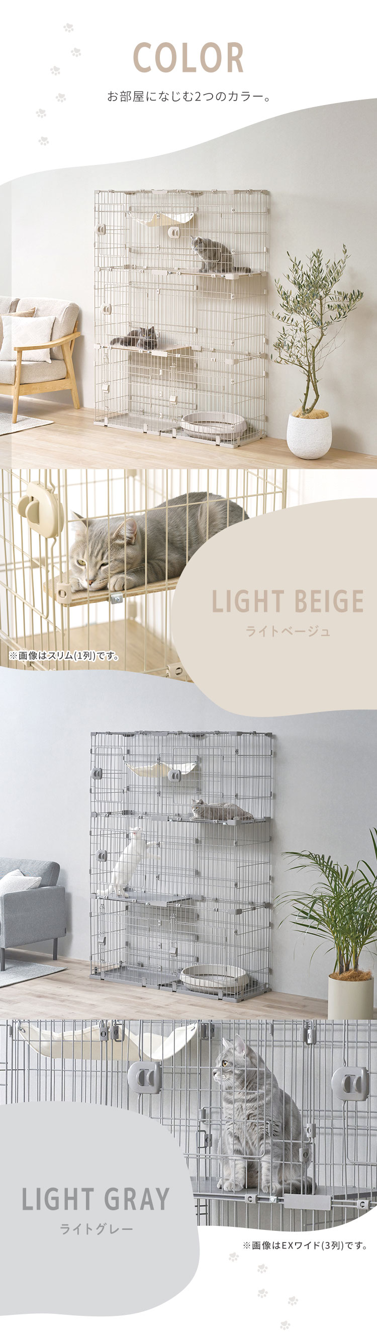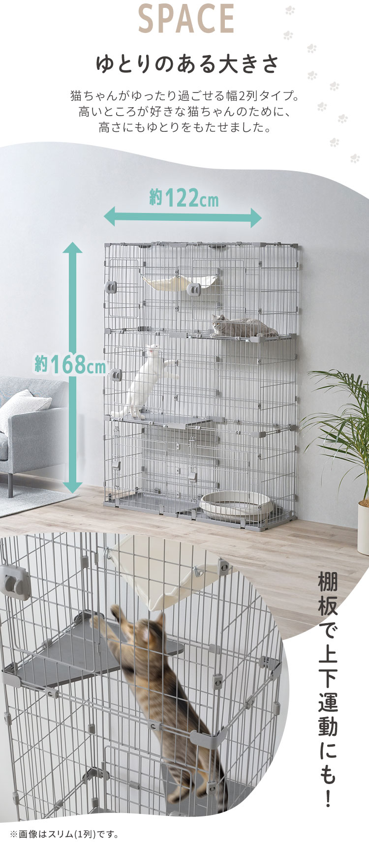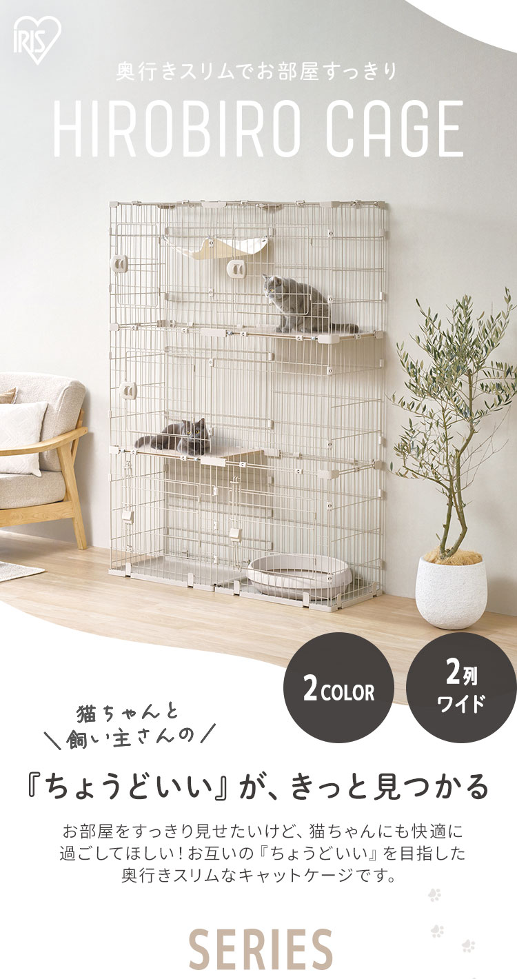 奥行きスリムでお部屋すっきり、広々スリムキャットケージです。