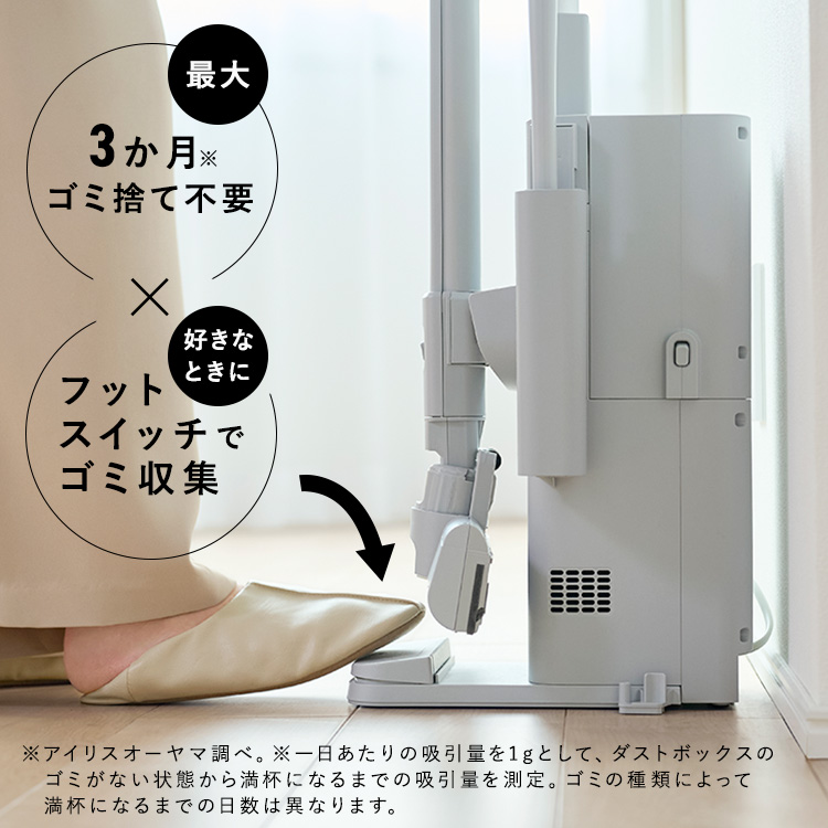 ※1 アイリスオーヤマ調べ。1日あたりの吸引量を1gとして、ダストボックスにごみがない状態から満杯になるまでの吸引量を測定。ごみの種類によって満杯になるまでの日数は異なります。