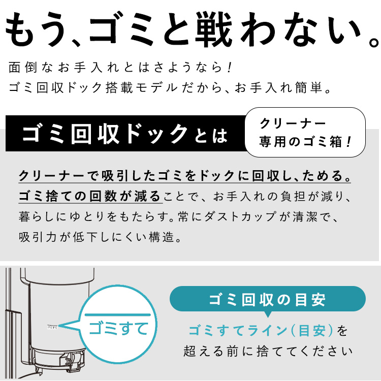 ゴミ回収ドック(充電機能付き)付きなので、お掃除が終わったらゴミ回収ドックに置くだけで、コンパクトに収納もできます。