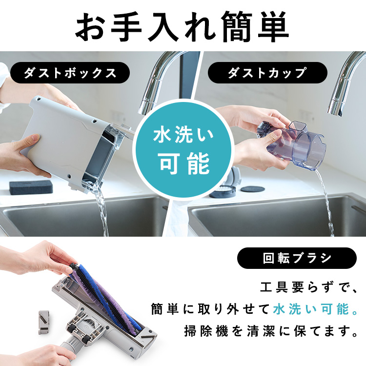 ダストボックス・スポンジフィルター・ダストカップは水洗いできるのでいつでも清潔に使用できます。