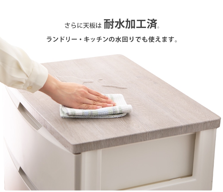 天板は耐水加工済なので、ランドリーやキッチンなどの水回りでも使えます。