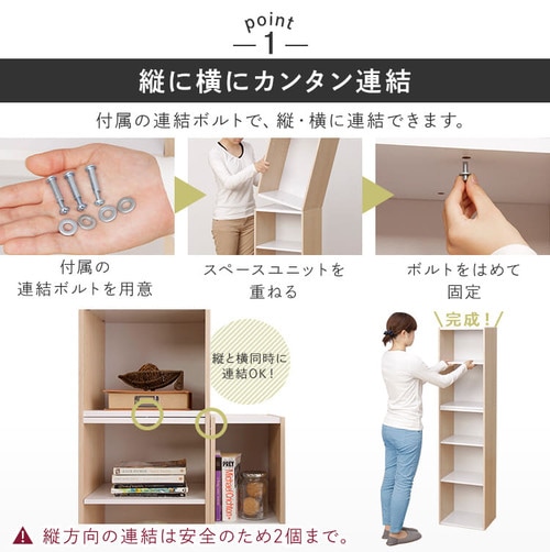 付属の連結用ボルトを使って、商品同士を縦方向・横方向に連結して使用することもできます。連結することで、様々な大きさのスペースに対応可能!
