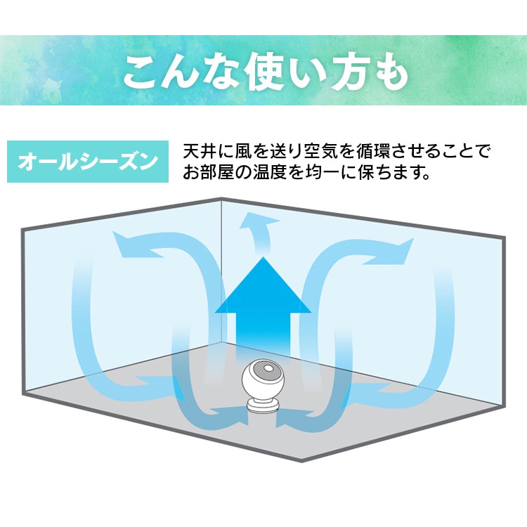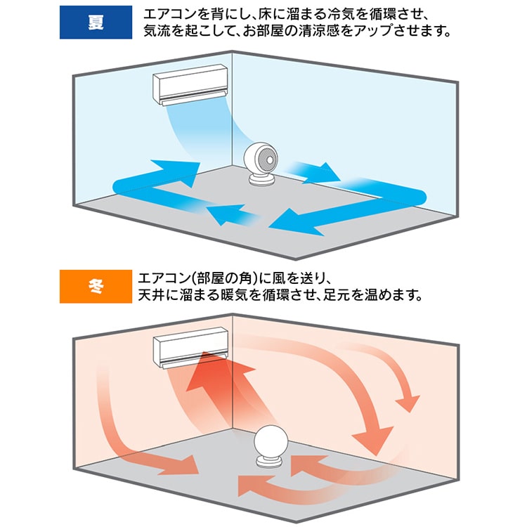 ・直線的なパワフル送風で室内の空気を循環させ、夏は冷房、冬は暖房効率を上げ一年中使えます。