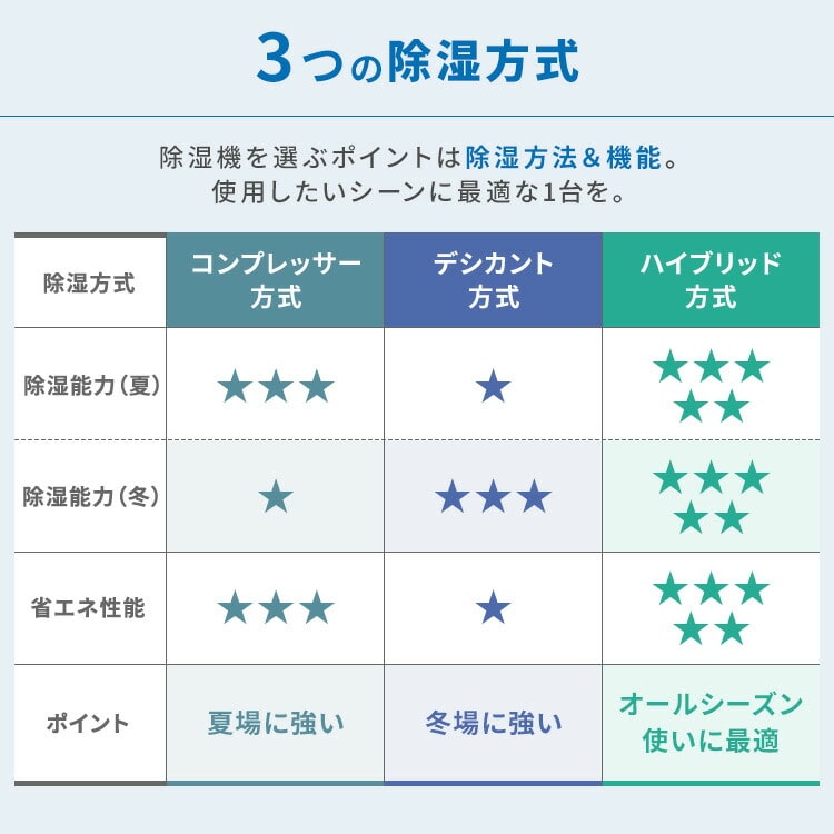 温度で除湿能力が落ちにくいので、衣類乾燥・押入れ除湿・結露対策と通年活躍。