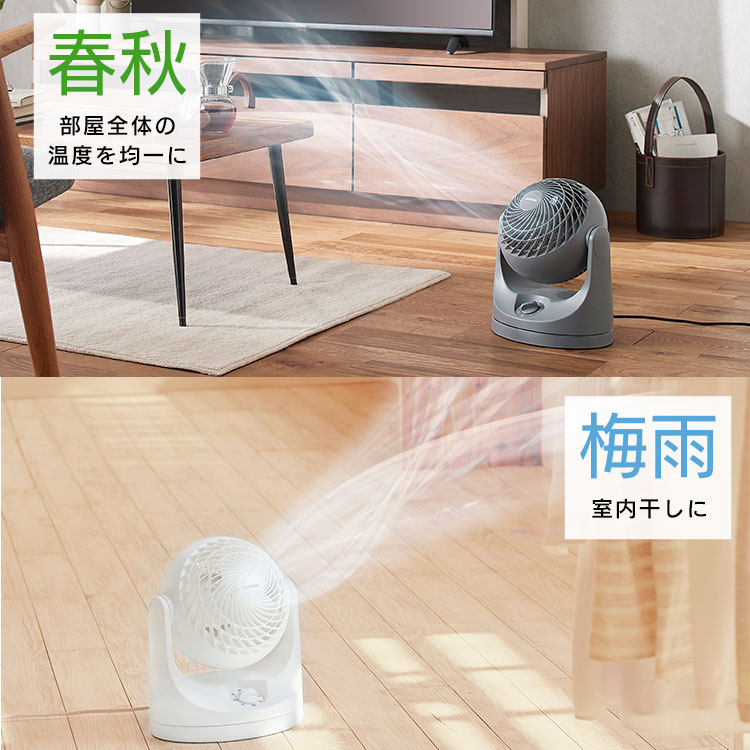 エアコンと併用して夏は冷気を部屋全体へ、冬は暖かい空気を足元へ循環し一年中使えます。